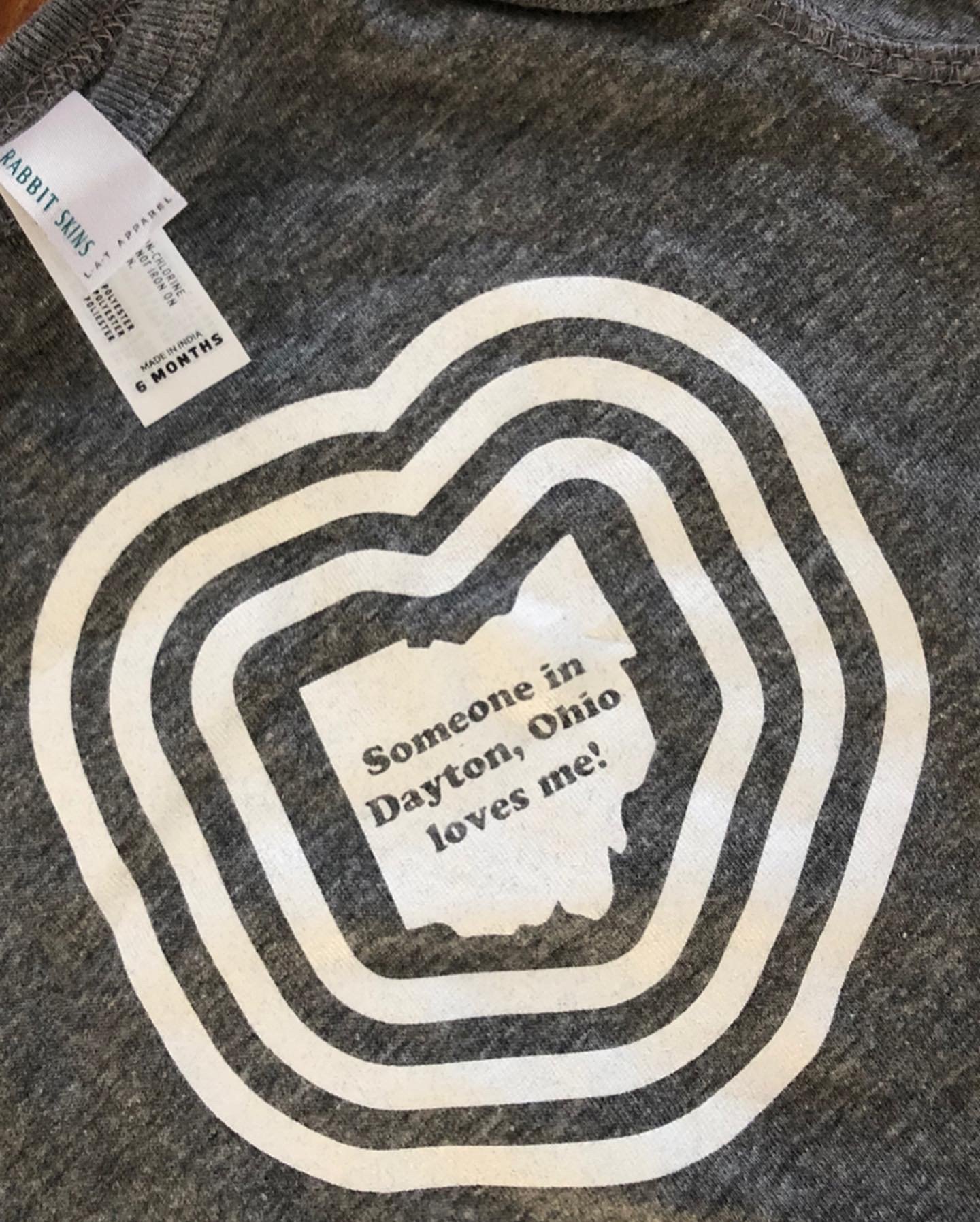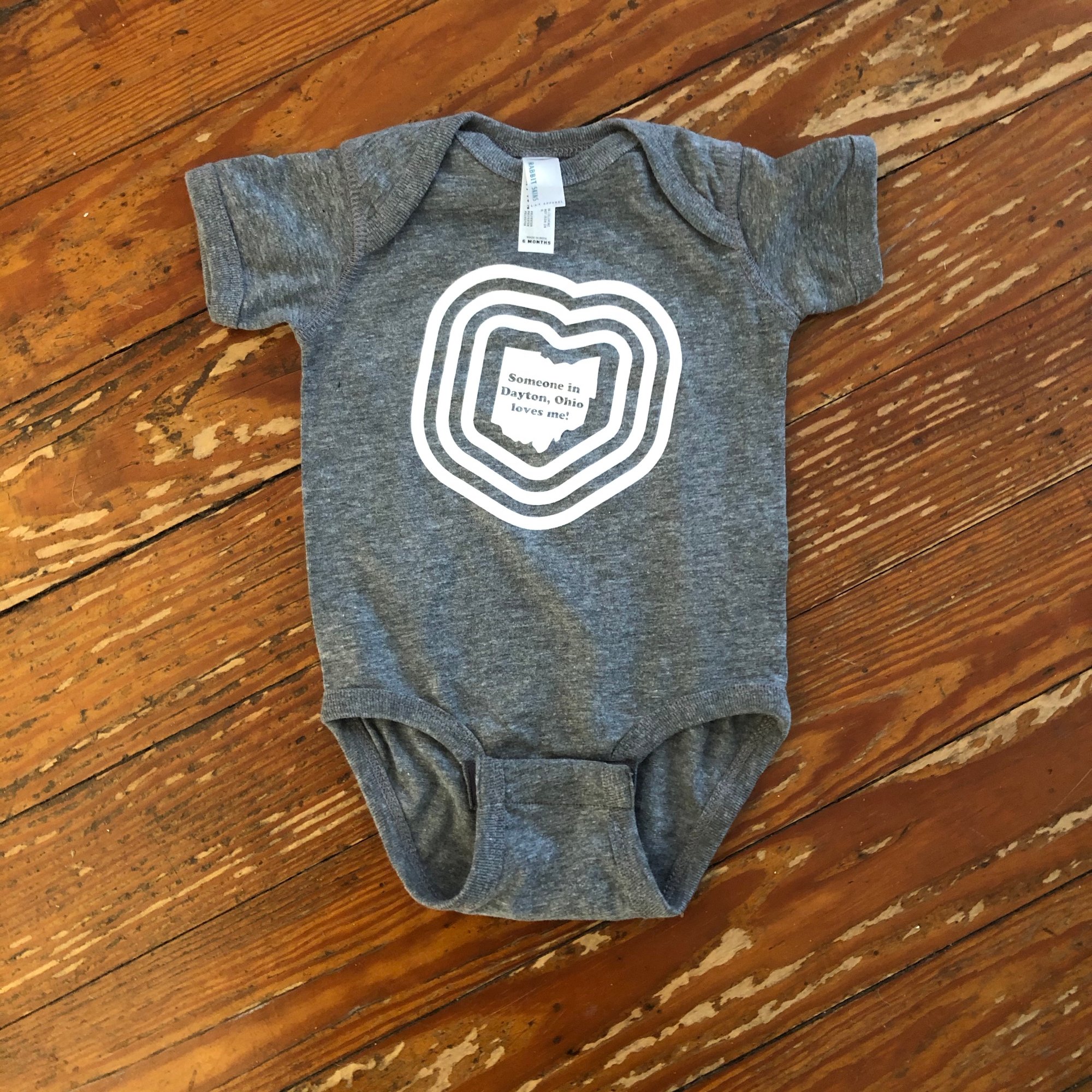 Kids' Onesie. Heather grey with white print on Rabbit Skins brand blank.
