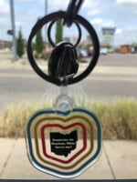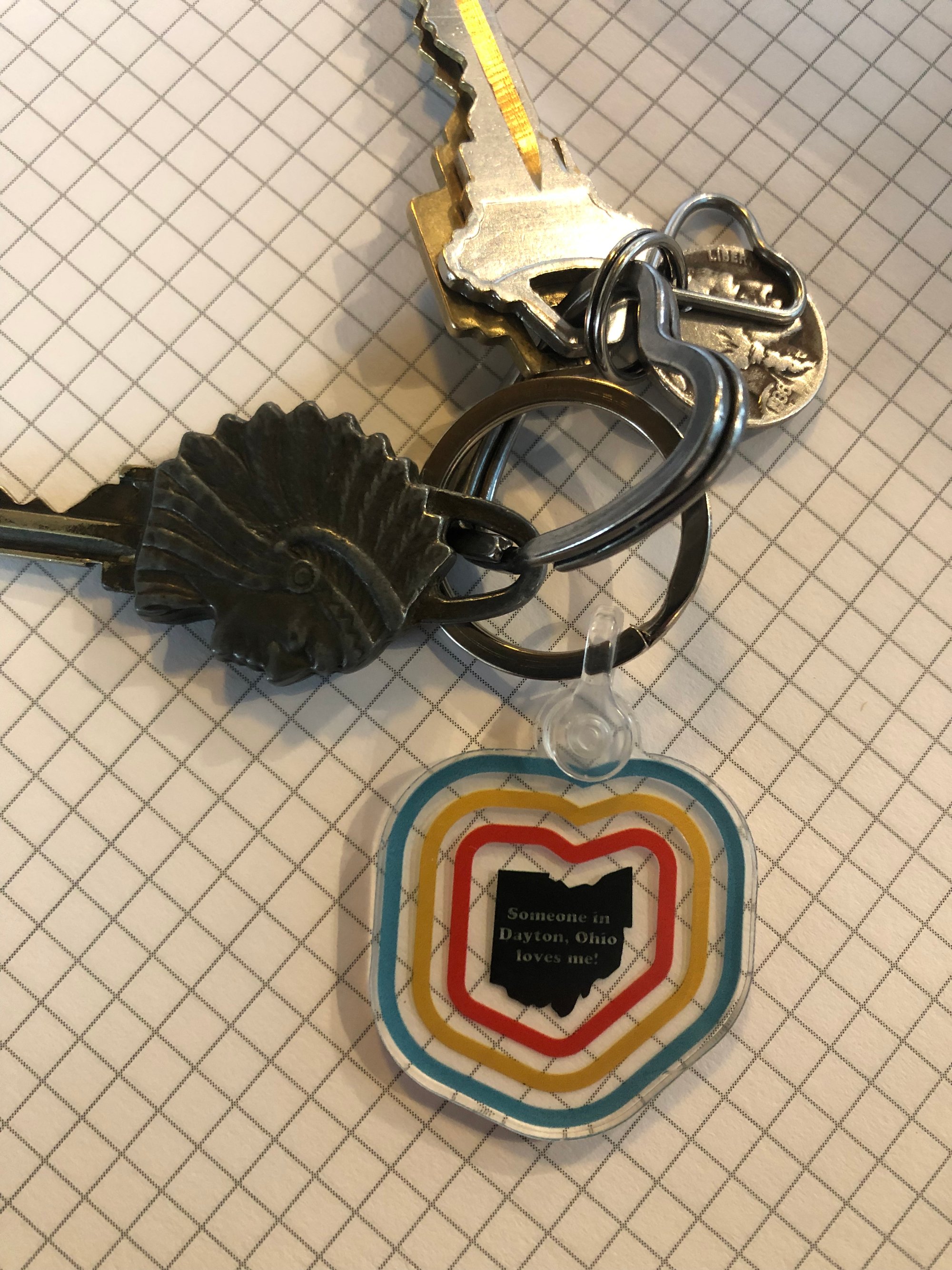 Small little dude to hang on your keychain. A reminder to you and/ or anyone you care about. Two sizes: 1.5” x 1.5” & 1. 85" x 1.85". Hard plastic.
